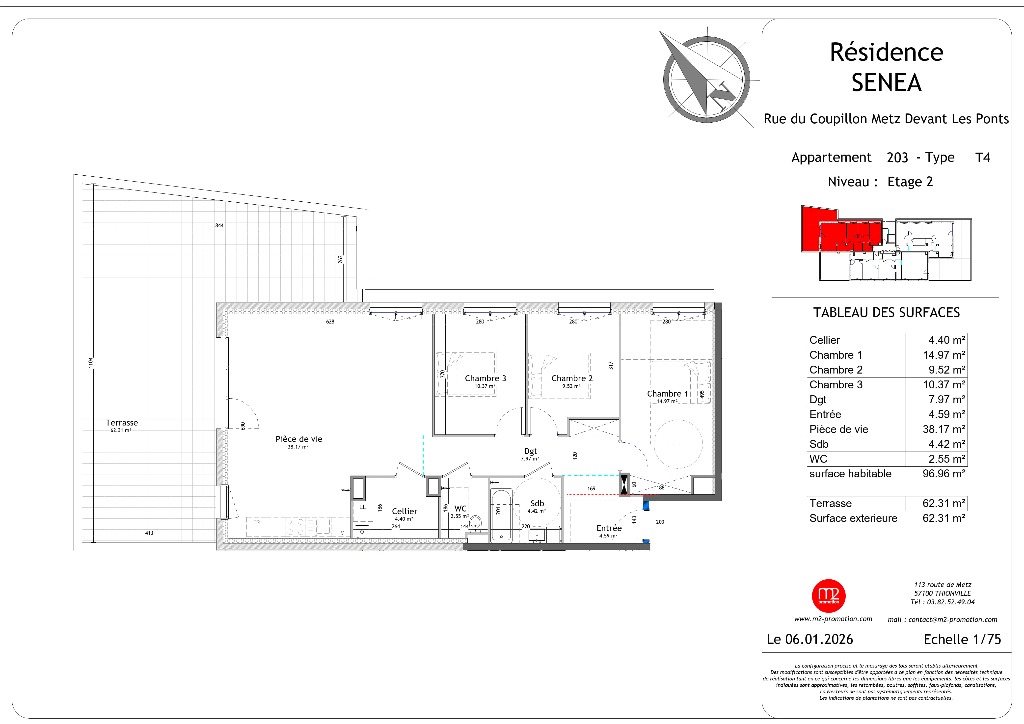 Découvrez une nouvelle adresse signée M2 PROMOTION, un environnement calme, verdoyant et privilégié vous attend au coeur de METZ Devant Les Ponts. La commune offre toutes les commodités necessaires au quotidien, écoles,  collége, commerces, médecin, pharmacie, banque... Vos transports et déplacements seront également facilités avec un accès immédiat à l’autoroute A31 qui vous permettra de rejoindre le Luxembourg en 45 mn seulement. Cette résidence à taille humaine et à l’architecture contemporaine est l'adresse idéale pour en faire sa résidence principale ou investir, 18 logements aux typologies variés et modulables se répartissent sur l'ensemble de la résidence allant du T2 au T4, adaptés à chaque projet de vie. Chaque logement dispose d’un espace extérieur, quelques-uns profitent de très grandes terrasses, un large choix de prestations permet à chaque acquéreur de composer un intérieur qui lui ressemble.